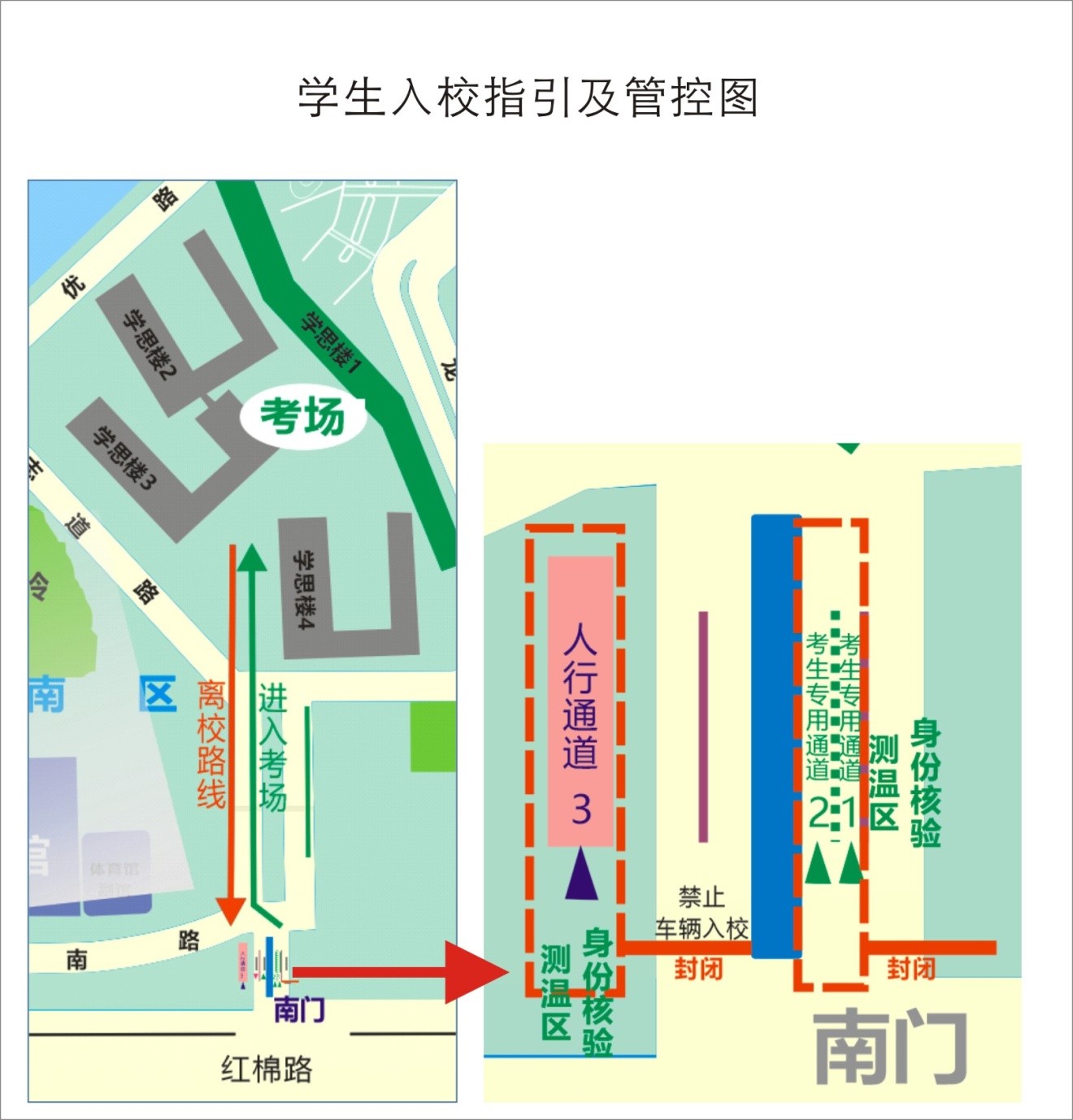 6.自行掌握好入校时间,听从学校安保人员指引,入校后从指定路线到达考场,考试结束后从原路离校,不要在校内逗留。