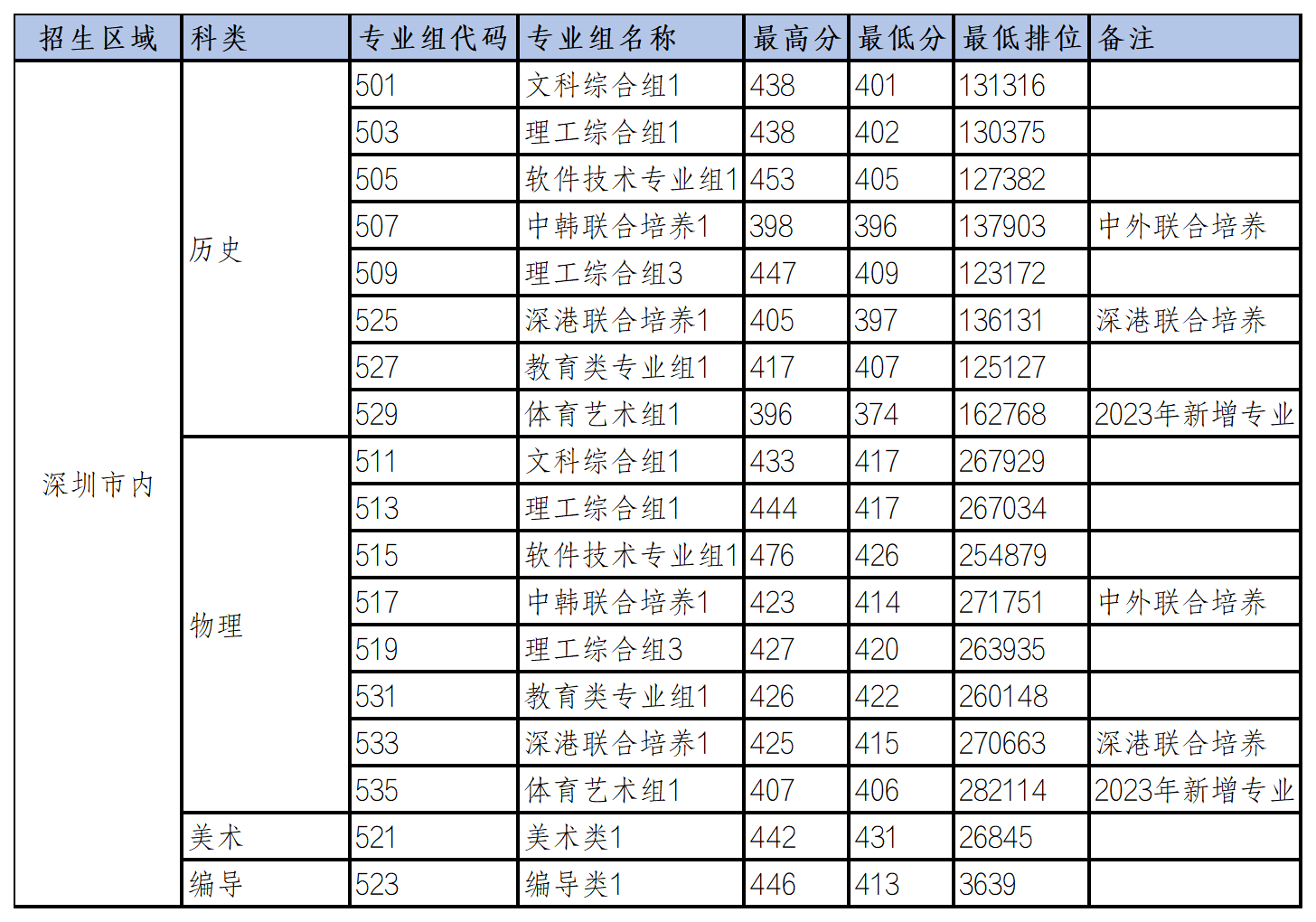1)深圳市内历史类普通专业组最低投档分数401,最低投档排位131316,相比去年提升31分、39690个排位;